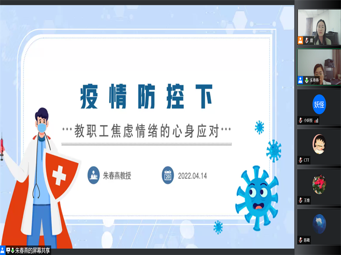 4月14日,校教职工心理健康服务中心邀请亚洲色吧 副院长朱春燕教授,以“疫情时期的焦虑情绪应对”为主题,为全校职工开展了一场线上公益讲座,提醒广大教职工做好“心理防疫”。全校500余名教职工线上参加活动。